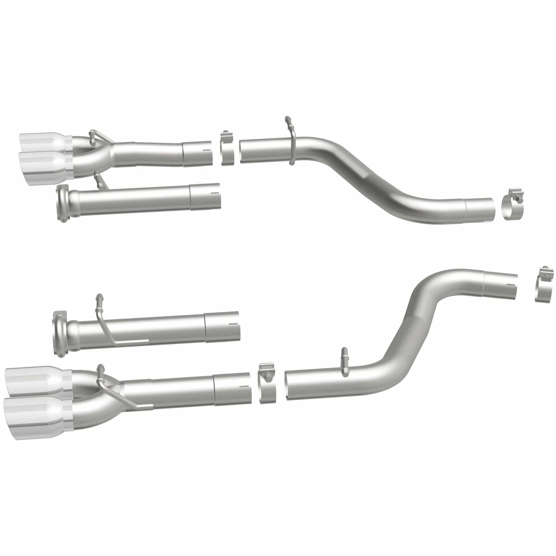 The MagnaFlow 2015-2016 Dodge Challenger Race Series Axle-Back Performance Exhaust System 19210 doesn't leave any performance on the table with a race-ready, light weight, dyno-proven design ready to help your 5.7L 2015-2016 Dodge Challenger take on any pretenders, whether on the track or the street. Exhaust kit 19210 is engineered to produce our powerful, resonant signature exhaust note at Very Aggressive exterior and Aggressive interior sound levels with an axle-back layout that replaces your vehicle's exhaust components from near the rear axle on back. Please check to ensure compliance with local noise regulations. This Dodge Challenger exhaust kit features fast-flowing mandrel bent 2.5in. diameter main piping that ends in a Quad Split Rear exit with 3.5in. Polished Welded-On Double Wall Angle Cut Folded Edge tips. Extensive 3D scanning during development and the use of advanced CNC precision robotic manufacturing techniques ensures that 19210's direct-fit design fits so perfectly that you can easily install the system yourself. The durable, corrosion resistant stainless steel construction of exhaust system 19210 is backed by MagnaFlow's limited lifetime warranty.