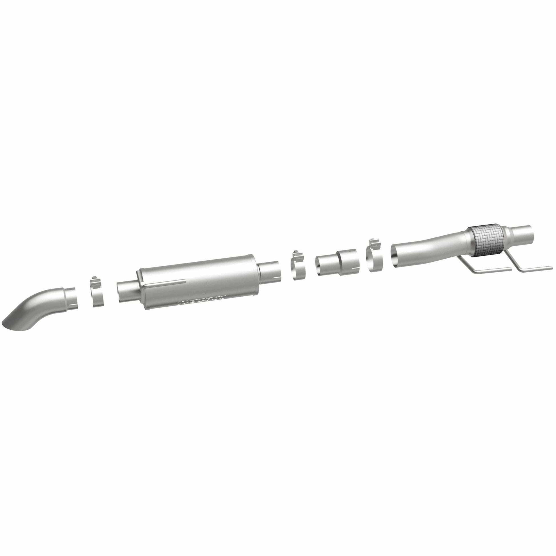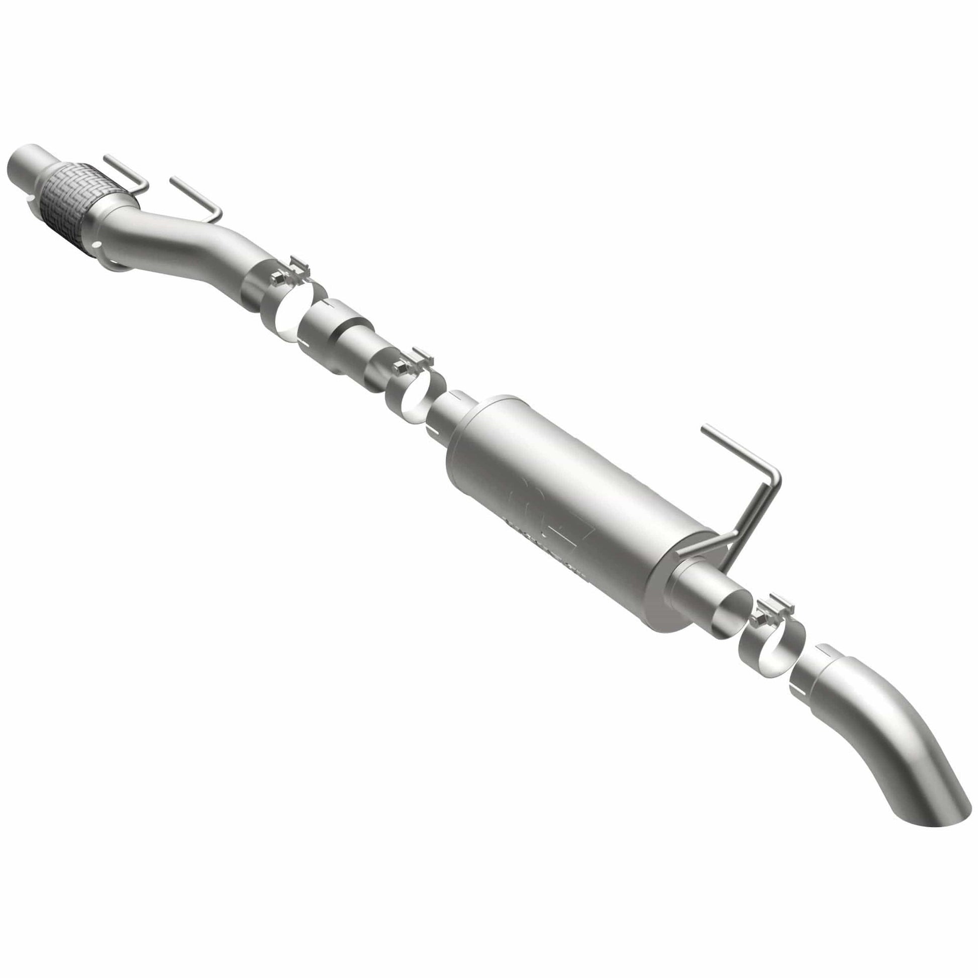 The MagnaFlow 2015-2020 Ford F-150 Off-Road Pro Series Cat-Back Performance Exhaust System brings additional off-roading prowess and our deep signature exhaust note to your 2.7L, 3.5L 2015-2020 Ford F-150 with a weight-optimized, dyno-tested, corrosion resistant and durable stainless steel design engineered to closely hug the undercarriage for improved ground clearance. Exhaust kit 19056 is engineered to produce Very Aggressive exterior and Aggressive interior sound levels. Extensive 3D scanning was used during the development of this Ford F-150 exhaust system to create a direct-fit design, enabling a do-it-yourself installation process. 19056's emissions-legal cat-back design replaces all your truck's exhaust components from the catalytic converter on back with its 3in. diameter mandrel bent main piping that passes through 1 Straight-Through mufflers before ending in a turndown before rear axle exit with 3in. Satin Clamp-On Single Wall Turndown Cut Edge tips. Exhaust system 19056 is produced using advanced CNC precision robotic manufacturing techniques and backed by MagnaFlow's limited lifetime warranty.
