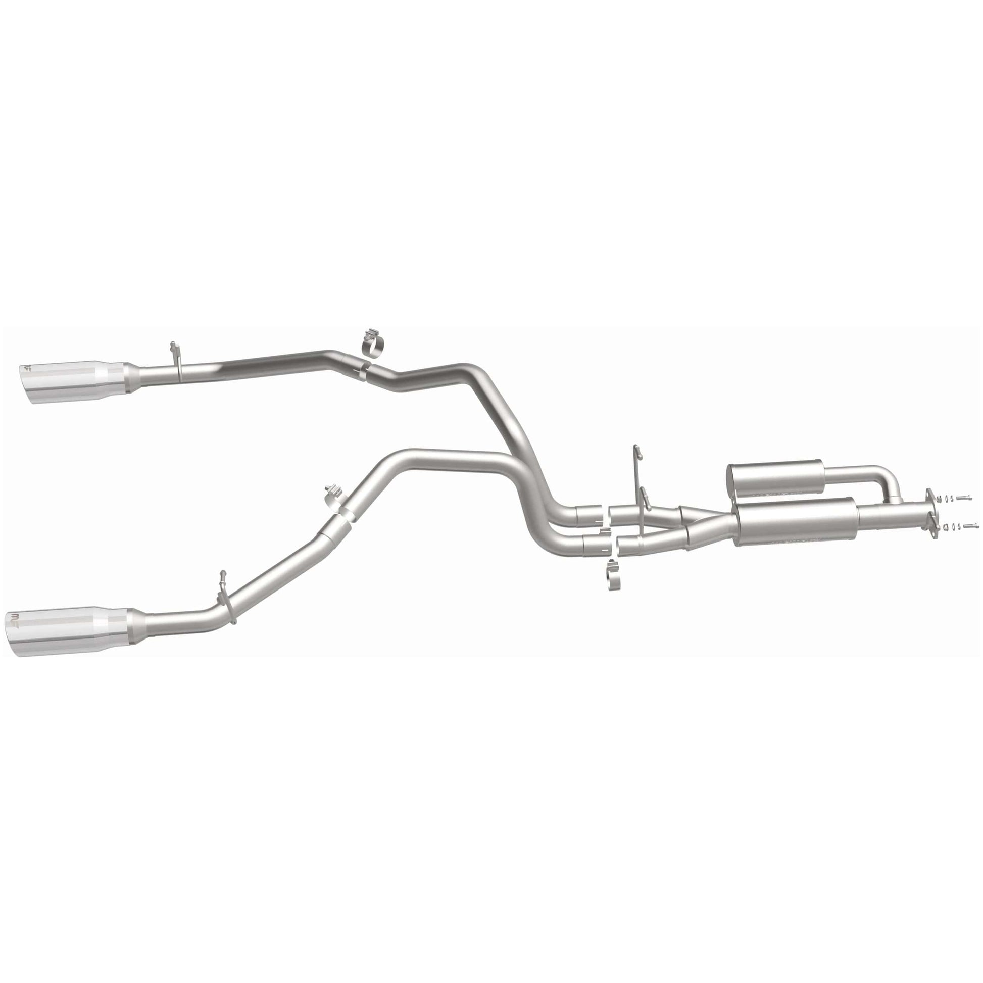 The MagnaFlow 2025 RAM 1500 I6-3.0L SPEQ Series Cat-Back Performance Exhaust System 19684 brings out the personality of your Truck with our signature resonant, powerful exhaust tone and dyno-proven performance. #19684 2.5” diameter mandrel bent main piping passes through a No Drone Technology (NDT) chamber and an all-new specifically tuned performance round muffler before exiting in a dual split rear exit with 5” polished tips. This full-size truck exhaust kit is the perfect equalizer between sound and performance. Upgrade your truck to the next level with an exhaust that has the pipes to put other trucks to shame. With this system your truck will be producing moderate exterior and mild interior sound levels while leaving other trucks feeling envious at every stoplight. Exhaust kit 19684 features a cat-back exhaust layout that replaces your trucks stock exhaust components from near the catalytic converter on back. Extensive 3D scanning during development has resulted in a direct-fit design that you can easily install yourself. 19684 is produced using CNC precision robotic manufacturing techniques and is backed by MagnaFlow's 1-year limited finish warranty and limited lifetime construction warranty.