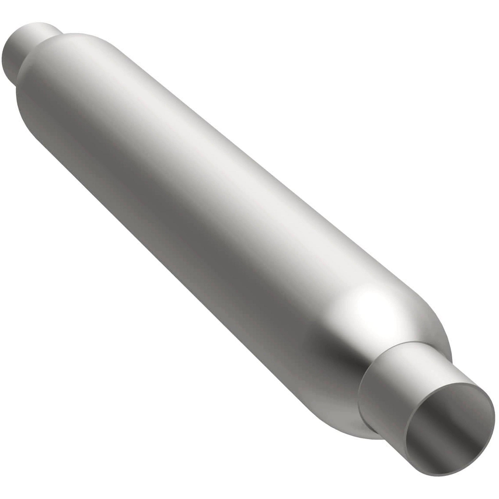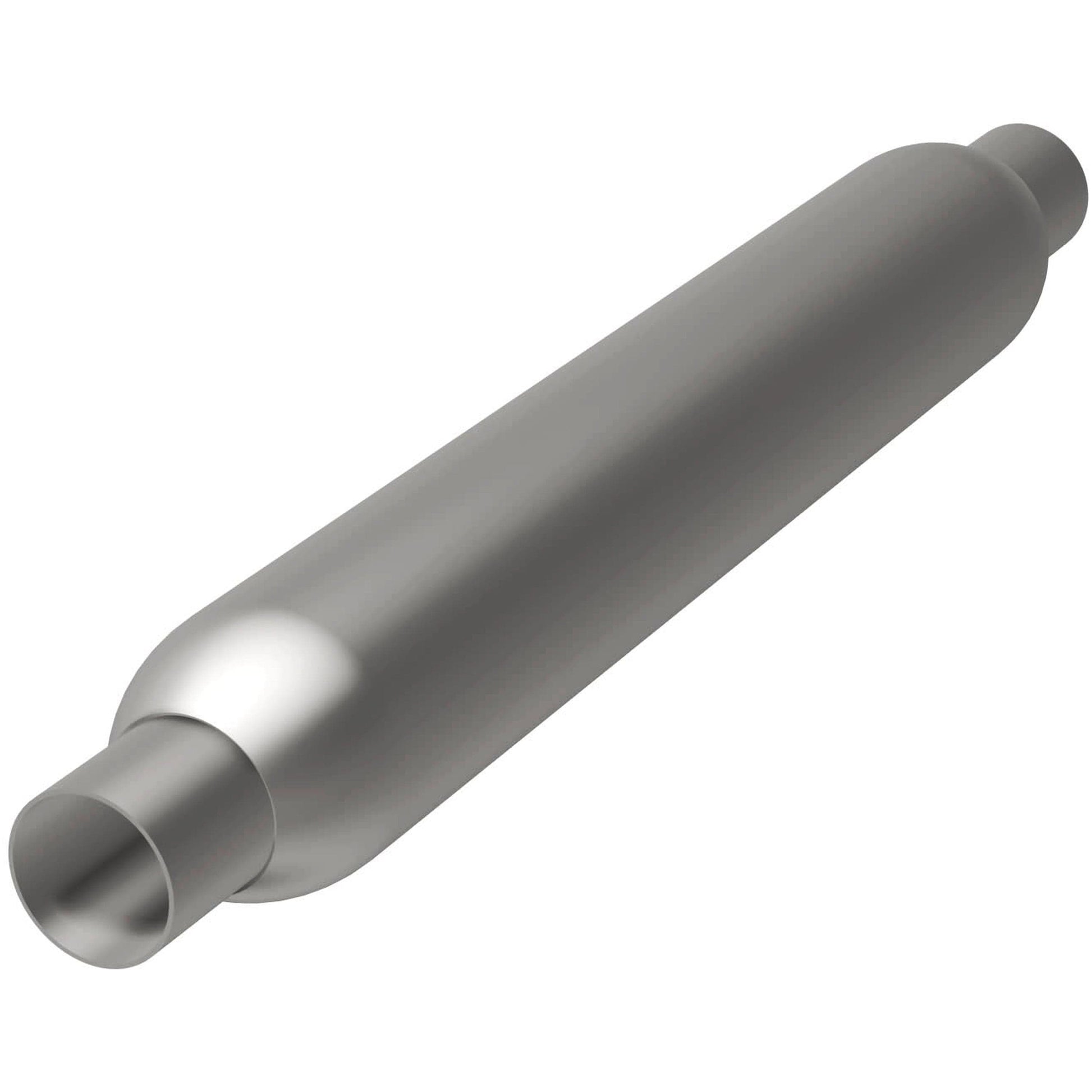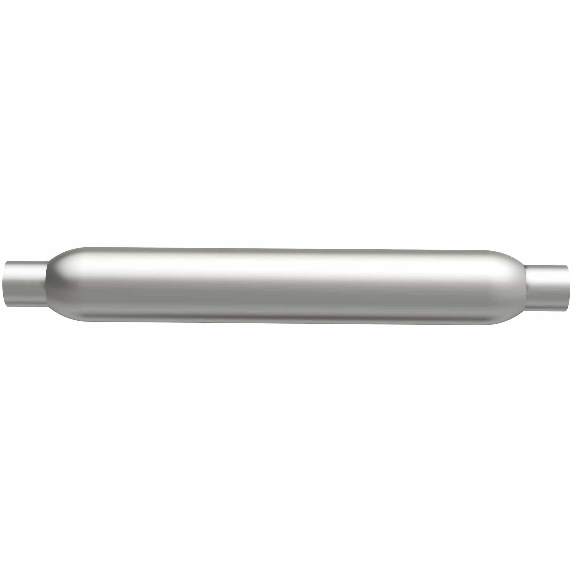 The MagnaFlow 3.5in. Round Glasspack Performance Exhaust Muffler 18134 enhances your ride with the deep, classic sound that glasspack mufflers are known for. The round muffler body features a free-flowing reversible straight-through 2/2in. diameter configuration and single stage packing with a satin finish. This weight-optimized glasspack muffler is engineered to bring out the inner hot rod in your ride with plenty of volume and dyno-proven performance, so please check to ensure compliance with local noise regulations. 18134 offers flexibility when it comes to installation thanks to its universal design, however, professional installation is recommended. Muffler 18134 is made of corrosion resistant aluminized steel and produced using CNC precision robotic manufacturing techniques, all backed by MagnaFlow's 90-day limited construction warranty.