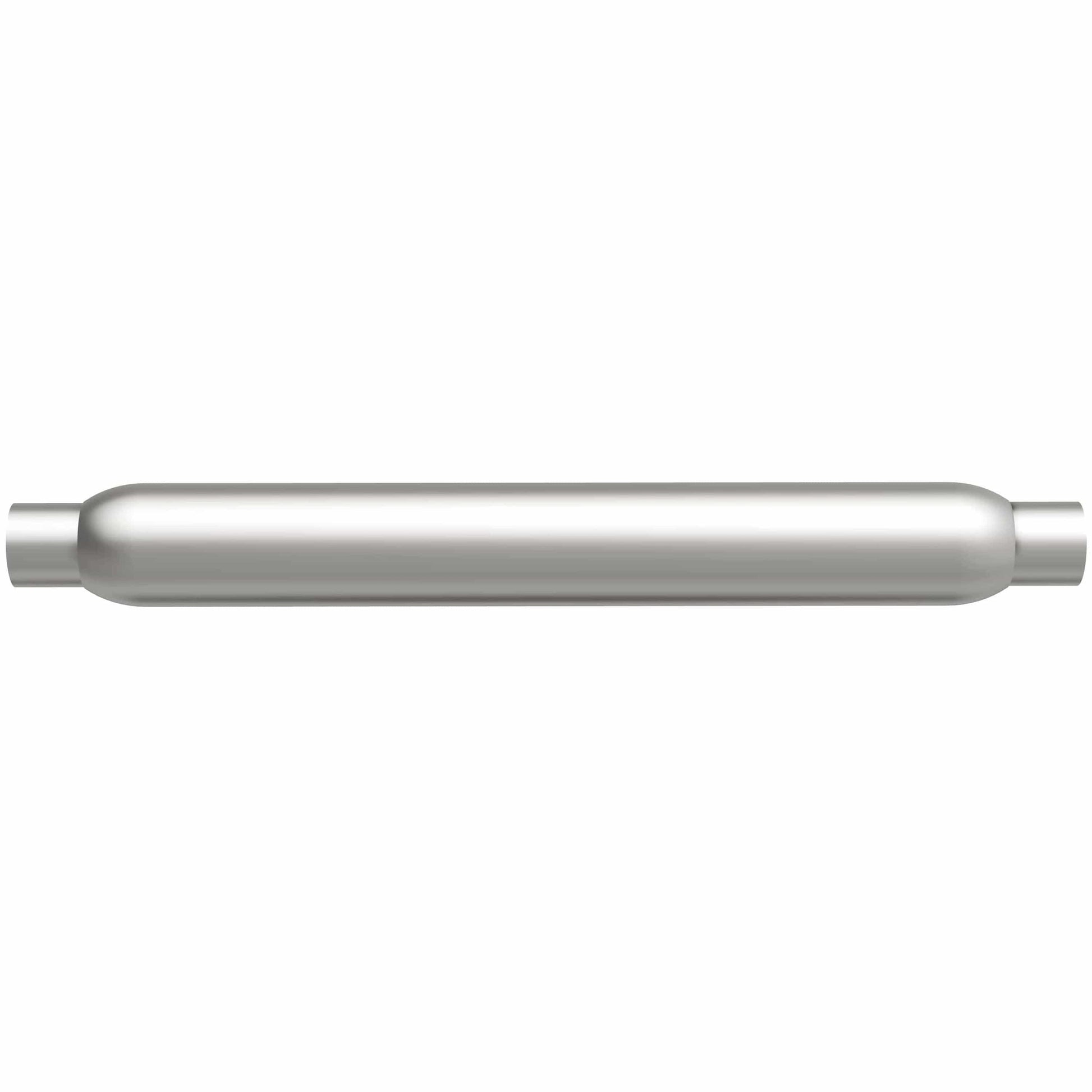 The MagnaFlow 3.5in. Round Glasspack Performance Exhaust Muffler 18145 enhances your ride with the deep, classic sound that glasspack mufflers are known for. The round muffler body features a free-flowing reversible straight-through 2.25/2.25in. diameter configuration and single stage packing with a satin finish. This weight-optimized glasspack muffler is engineered to bring out the inner hot rod in your ride with plenty of volume and dyno-proven performance, so please check to ensure compliance with local noise regulations. 18145 offers flexibility when it comes to installation thanks to its universal design, however, professional installation is recommended. Muffler 18145 is made of corrosion resistant aluminized steel and produced using CNC precision robotic manufacturing techniques, all backed by MagnaFlow's 90-day limited construction warranty.