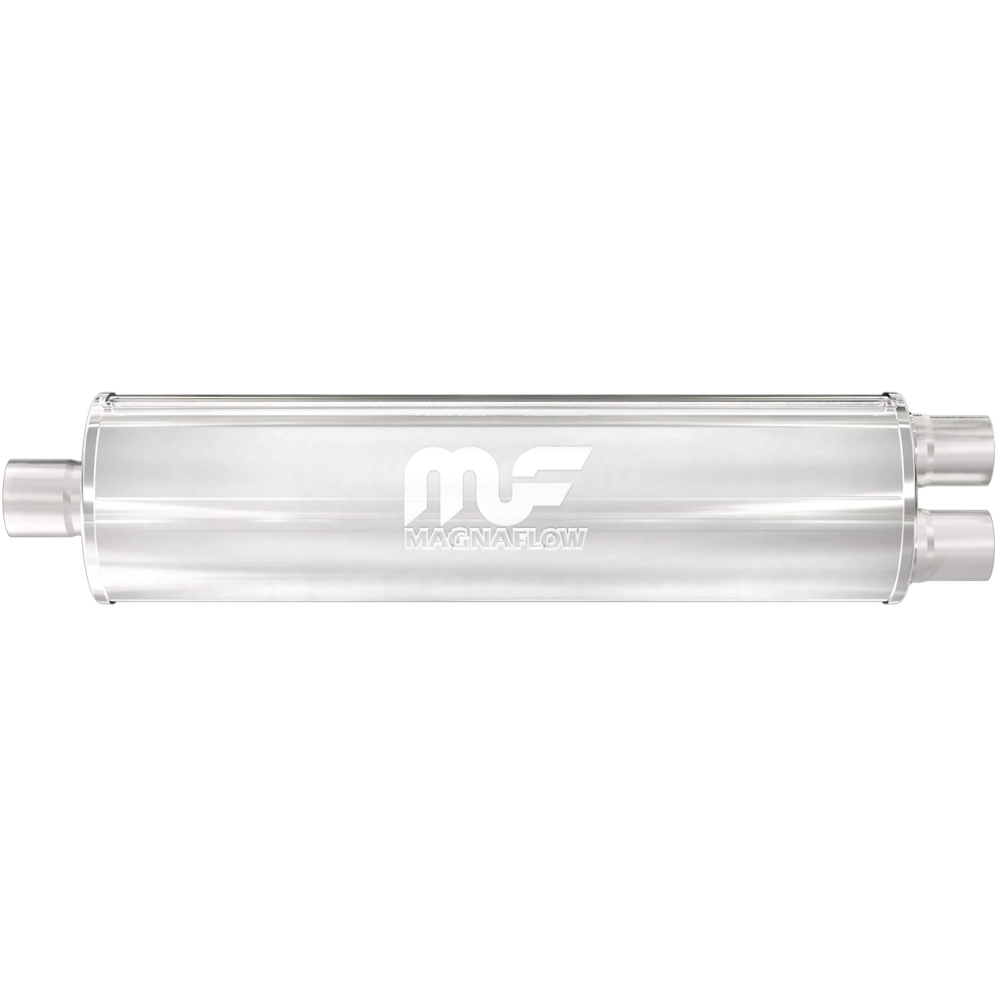 The MagnaFlow 7in. Round Straight-Through Performance Exhaust Muffler 12761 brings our world-famous exhaust sound and dyno-proven performance to your ride in a weight-optimized 7x7x27in. package with a premium satin finish. The straight-through free-flowing design of this round-bodied muffler's reversible, universal 2.5/2.25in. diameter inlet/outlet layout enables versatile installation options to match the spacing requirements of your vehicle. Due to the cutting and welding involved, professional installation is highly recommended. Internally, 12761 utilizes a perforated stainless steel core wrapped in stainless steel mesh and acoustic fiber fill to achieve a powerful, resonant tone. This muffler is made of durable, corrosion resistant stainless steel and produced using cutting-edge CNC precision robotic manufacturing techniques, all backed by MagnaFlow's limited lifetime construction warranty.