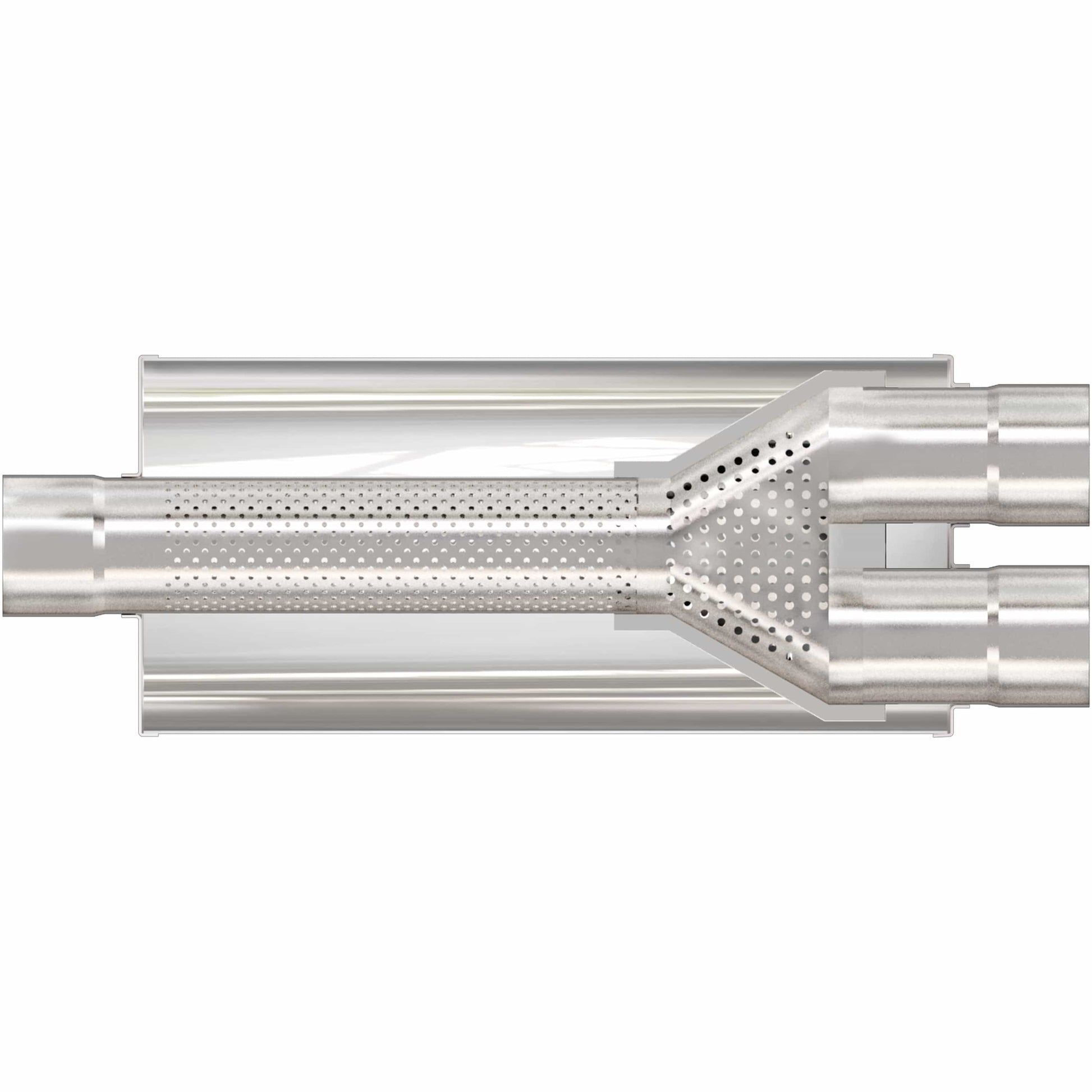 The MagnaFlow 7in. Round Straight-Through Performance Exhaust Muffler 12763 brings our world-famous exhaust sound and dyno-proven performance to your ride in a weight-optimized 7x7x24in. package with a premium satin finish. The straight-through free-flowing design of this round-bodied muffler's reversible, universal 3/2.5in. diameter inlet/outlet layout enables versatile installation options to match the spacing requirements of your vehicle. Due to the cutting and welding involved, professional installation is highly recommended. Internally, 12763 utilizes a perforated stainless steel core wrapped in stainless steel mesh and acoustic fiber fill to achieve a powerful, resonant tone. This muffler is made of durable, corrosion resistant stainless steel and produced using cutting-edge CNC precision robotic manufacturing techniques, all backed by MagnaFlow's limited lifetime construction warranty.
