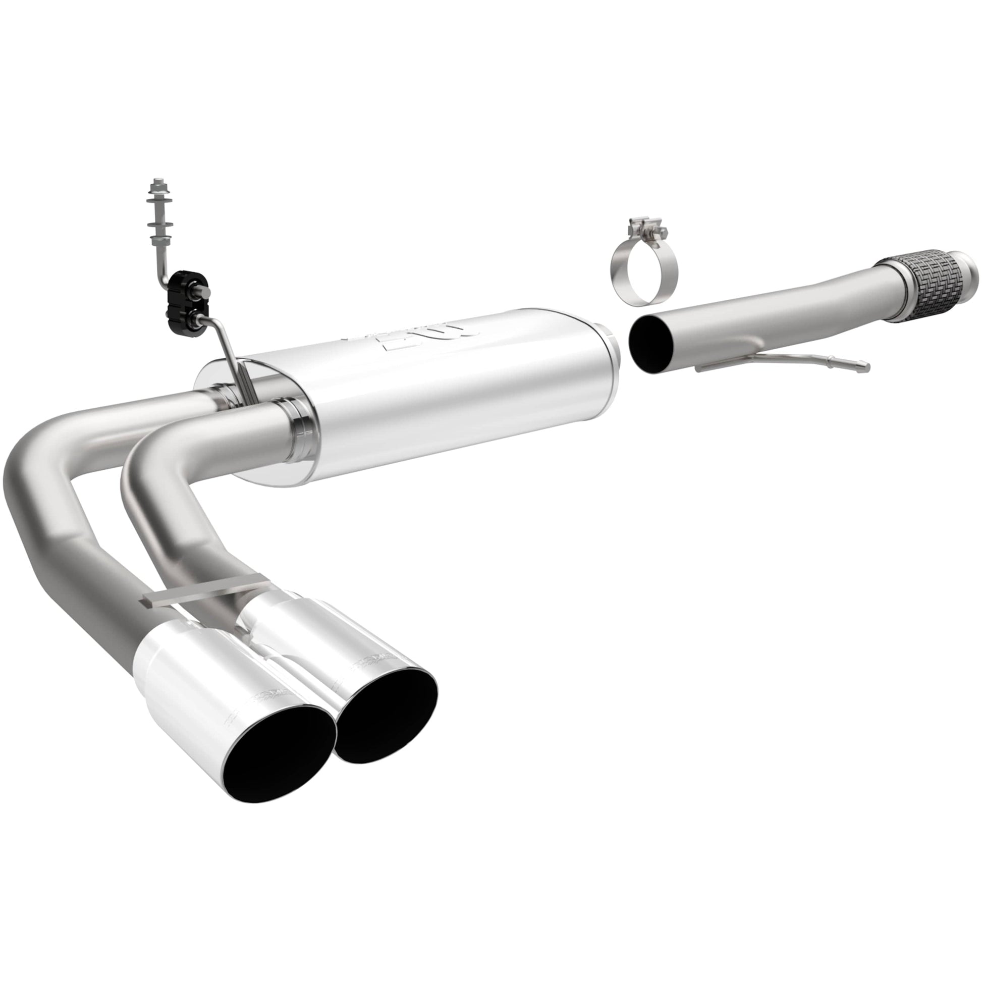 The MagnaFlow Street Series Cat-Back Performance Exhaust System 15270 brings out the personality of your Truck with our signature resonant, powerful engine tone and dyno-proven performance. Thanks to its fast-flowing, mandrel bent 3in. main piping and 1 Straight-Through mufflers ending in a Dual Same Side Before Passenger Rear Tire exit with 3.5in. Polished Welded-On Double Wall Angle Cut Folded Edge tips, this Truck exhaust kit has the performance chops to match its sporty sound and appearance. Upgrade your ride to the next level with an exhaust that has the pipes to put other Truck's to shame. With this system your vehicle will be producing Very Aggressive exterior and Aggressive interior sound levels while leaving other cars and trucks feeling envious at every stoplight. Exhaust kit 15270 features a cat-back layout that replaces your ride's stock exhaust components from near the catalytic converter on back. Extensive 3D scanning during development has resulted in a direct-fit design that you can easily install yourself. 15270 is produced using CNC precision robotic manufacturing techniques and is backed by MagnaFlow's 1-year limited finish warranty and limited lifetime construction warranty.