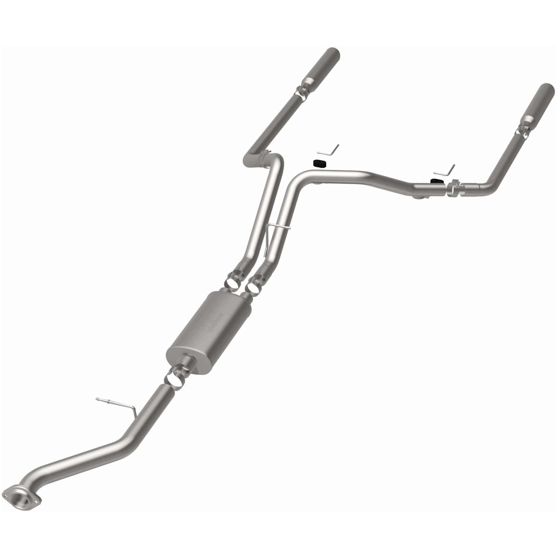The MagnaFlow Street Series Cat-Back Performance Exhaust System 15753 brings out the personality of your Truck with our signature resonant, powerful engine tone and dyno-proven performance. Thanks to its fast-flowing, mandrel bent 3in. main piping and 1 Straight-Through mufflers ending in a Dual Split Rear exit with 3.5in. Polished Clamp-On Single Wall Angle Cut Rolled Edge tips, this Truck exhaust kit has the performance chops to match its sporty sound and appearance. Upgrade your ride to the next level with an exhaust that has the pipes to put other Truck's to shame. With this system your vehicle will be producing Aggressive exterior and Moderate interior sound levels while leaving other cars and trucks feeling envious at every stoplight. Exhaust kit 15753 features a cat-back layout that replaces your ride's stock exhaust components from near the catalytic converter on back. Extensive 3D scanning during development has resulted in a direct-fit design that you can easily install yourself. 15753 is produced using CNC precision robotic manufacturing techniques and is backed by MagnaFlow's 1-year limited finish warranty and limited lifetime construction warranty.