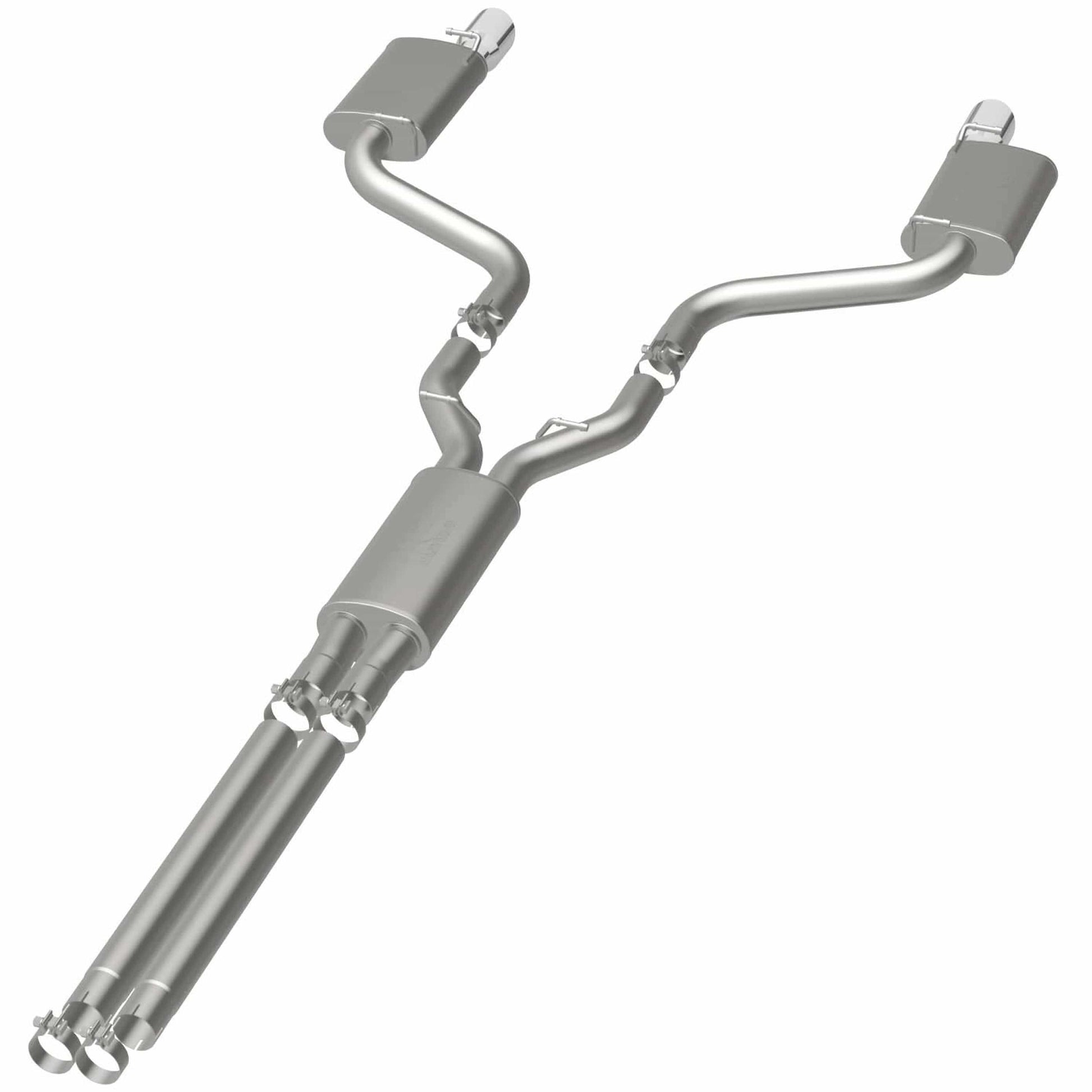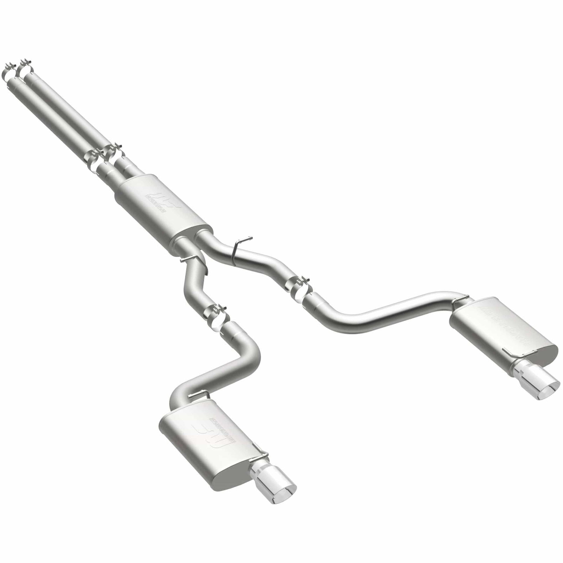 The MagnaFlow Street Series Cat-Back Performance Exhaust System 16642 brings out the personality of your Car with our signature resonant, powerful engine tone and dyno-proven performance. Thanks to its fast-flowing, mandrel bent 3in. main piping and 3 Straight-Through mufflers ending in a Dual Split Rear exit with 4in. Polished Welded-On Double Wall Angle Cut Folded Edge tips, this Car exhaust kit has the performance chops to match its sporty sound and appearance. Upgrade your ride to the next level with an exhaust that has the pipes to put other Car's to shame. With this system your vehicle will be producing Moderate exterior and Mild interior sound levels while leaving other cars and trucks feeling envious at every stoplight. Exhaust kit 16642 features a cat-back layout that replaces your ride's stock exhaust components from near the catalytic converter on back. Extensive 3D scanning during development has resulted in a direct-fit design that you can easily install yourself. 16642 is produced using CNC precision robotic manufacturing techniques and is backed by MagnaFlow's 1-year limited finish warranty and limited lifetime construction warranty.