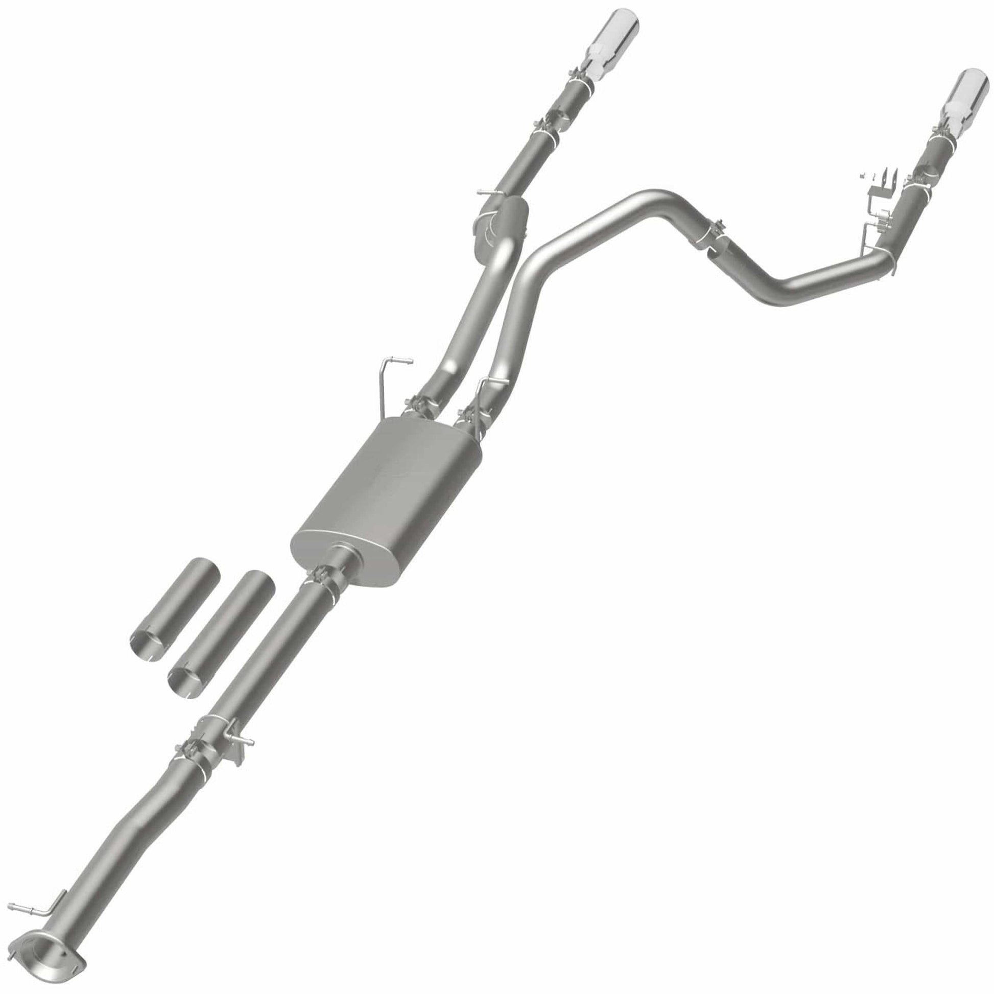 The MagnaFlow Street Series Cat-Back Performance Exhaust System 19027 brings out the personality of your Truck with our signature resonant, powerful engine tone and dyno-proven performance. Thanks to its fast-flowing, mandrel bent 3.5in. main piping and 1 Straight-Through mufflers ending in a Dual Split Rear exit with 4in. Polished Clamp-On Double Wall Angle Cut Rolled Edge tips, this Truck exhaust kit has the performance chops to match its sporty sound and appearance. Upgrade your ride to the next level with an exhaust that has the pipes to put other Truck's to shame. With this system your vehicle will be producing Aggressive exterior and Moderate interior sound levels while leaving other cars and trucks feeling envious at every stoplight. Exhaust kit 19027 features a cat-back layout that replaces your ride's stock exhaust components from near the catalytic converter on back. Extensive 3D scanning during development has resulted in a direct-fit design that you can easily install yourself. 19027 is produced using CNC precision robotic manufacturing techniques and is backed by MagnaFlow's 1-year limited finish warranty and limited lifetime construction warranty.