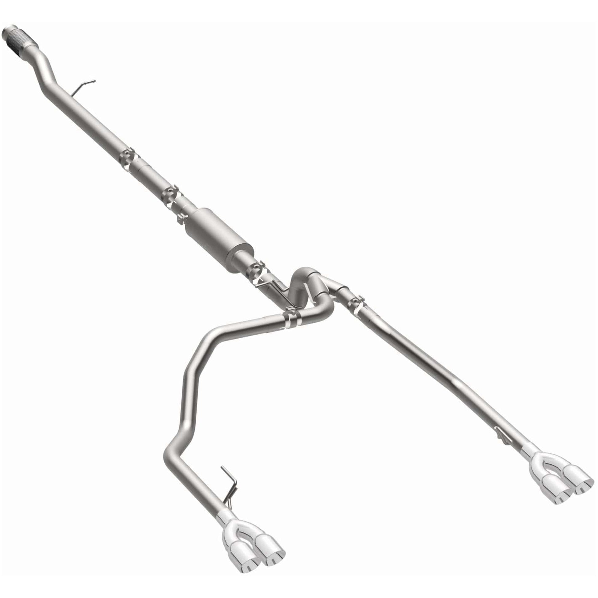 The MagnaFlow Street Series Cat-Back Performance Exhaust System 19489 brings out the personality of your Truck with our signature resonant, powerful engine tone and dyno-proven performance. Thanks to its fast-flowing, mandrel bent 3.5in. main piping and 1 Straight-Through mufflers ending in a Quad Split Rear exit with 3.5in. Polished Welded-On Double Wall Angle Cut Folded Edge tips, this Truck exhaust kit has the performance chops to match its sporty sound and appearance. Upgrade your ride to the next level with an exhaust that has the pipes to put other Truck's to shame. With this system your vehicle will be producing Aggressive exterior and Moderate interior sound levels while leaving other cars and trucks feeling envious at every stoplight. Exhaust kit 19489 features a cat-back layout that replaces your ride's stock exhaust components from near the catalytic converter on back. Extensive 3D scanning during development has resulted in a direct-fit design that you can easily install yourself. 19489 is produced using CNC precision robotic manufacturing techniques and is backed by MagnaFlow's 1-year limited finish warranty and limited lifetime construction warranty.