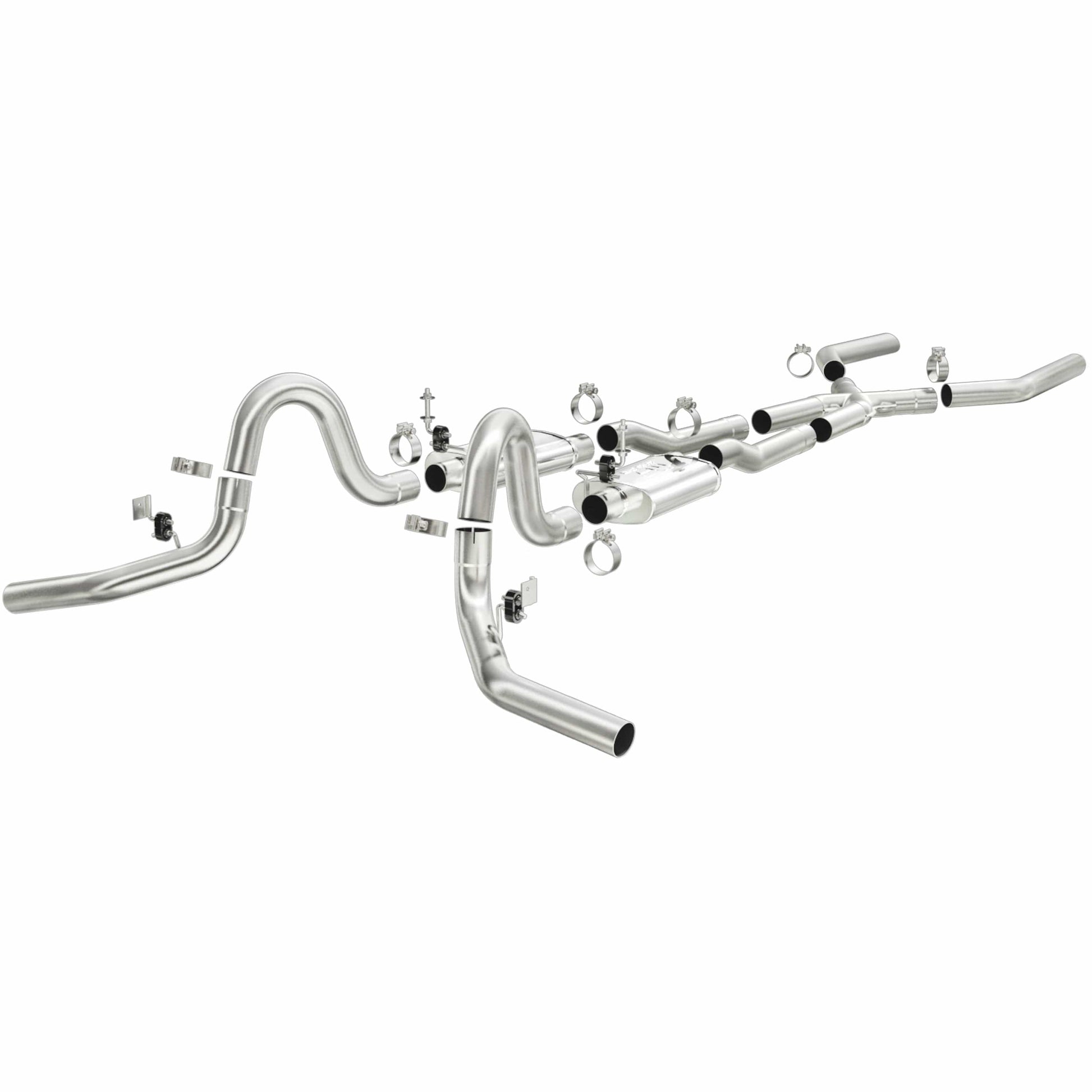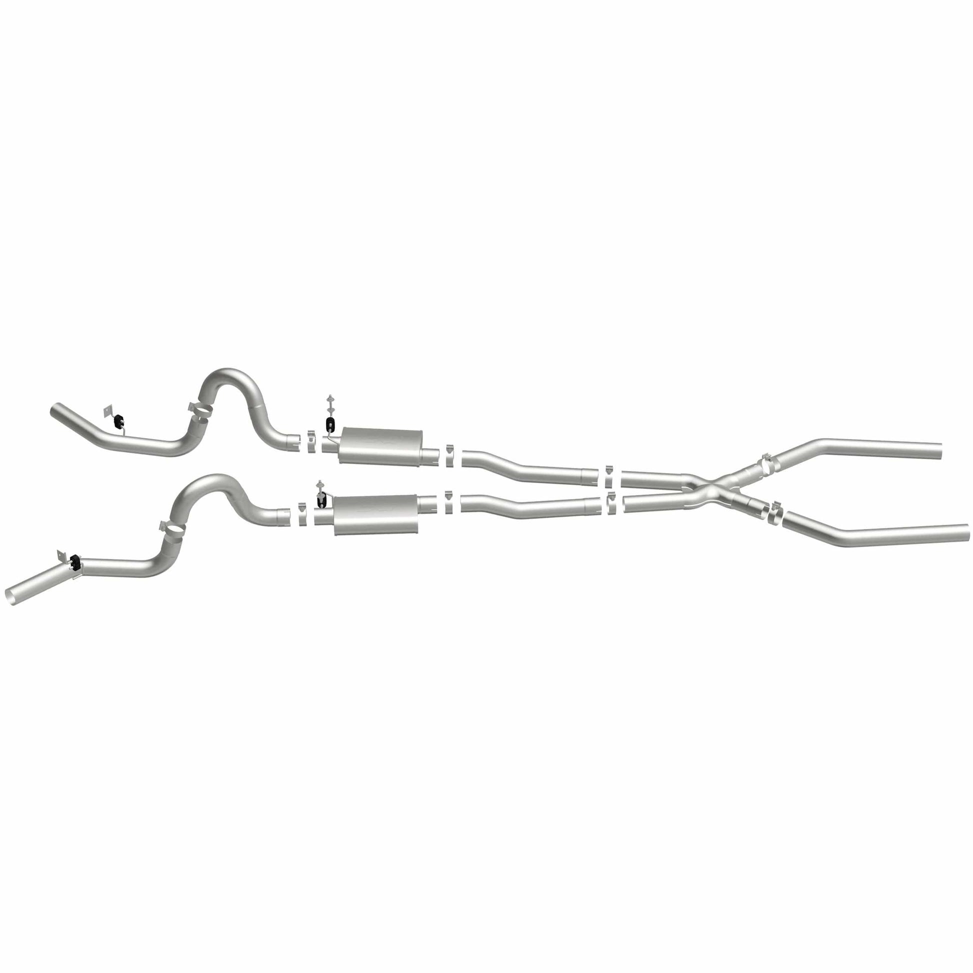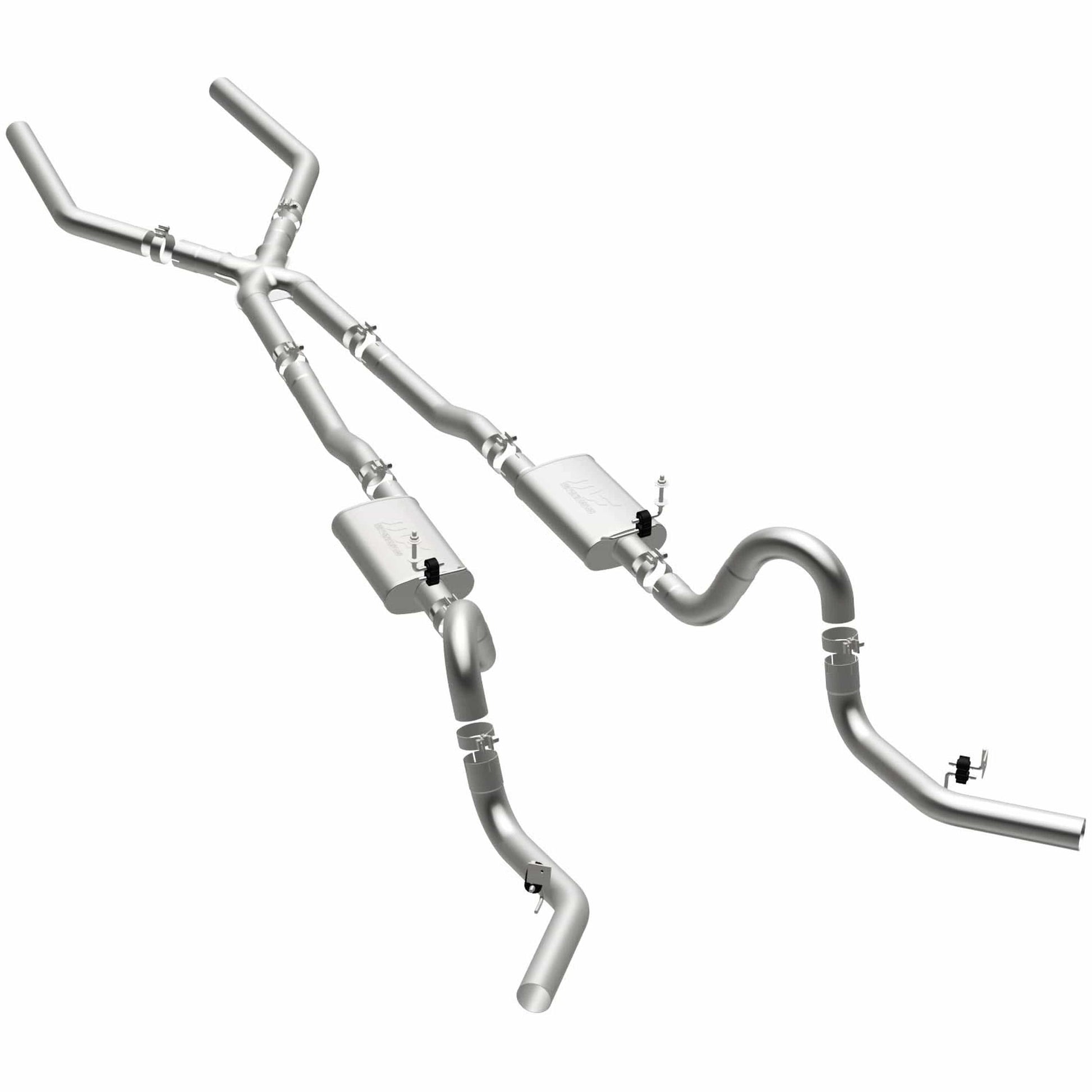 The MagnaFlow Street Series Crossmember-Back Performance Exhaust System 15898 brings enhanced engine sound and dyno-proven performance to your muscle car with a healthy helping of our deep, resonant signature exhaust note at Aggressive exterior and Moderate interior sound levels. Thanks to its durable, corrosion resistant stainless steel design, this exhaust system will handle whatever tarmac you decide to leave your mark on. This performance exhaust kit features a crossmember-back layout designed to replace your exhaust system from the crossmember on back. With its fast-flowing, mandrel bent 3in. main piping and 2 Straight-Through mufflers ending in a Dual Split Rear Behind Rear Tires exit that you can enhance with tips of your choosing, your muscle car will be sounding as awesome as it looks. Extensive 3D scanning during development has resulted in a direct-fit design that you can easily install yourself. 15898 is produced using CNC precision robotic manufacturing techniques and is backed by MagnaFlow's limited lifetime construction warranty.