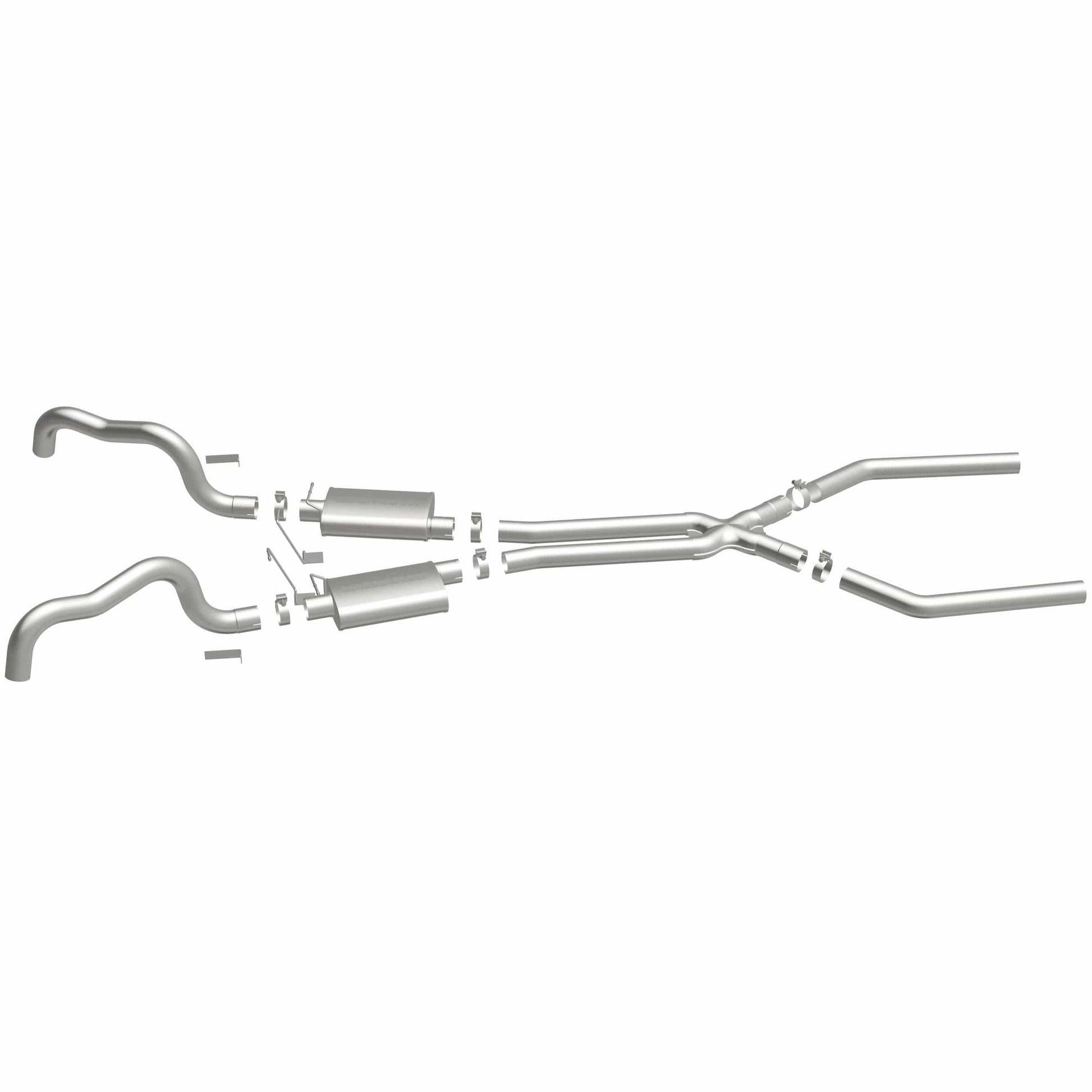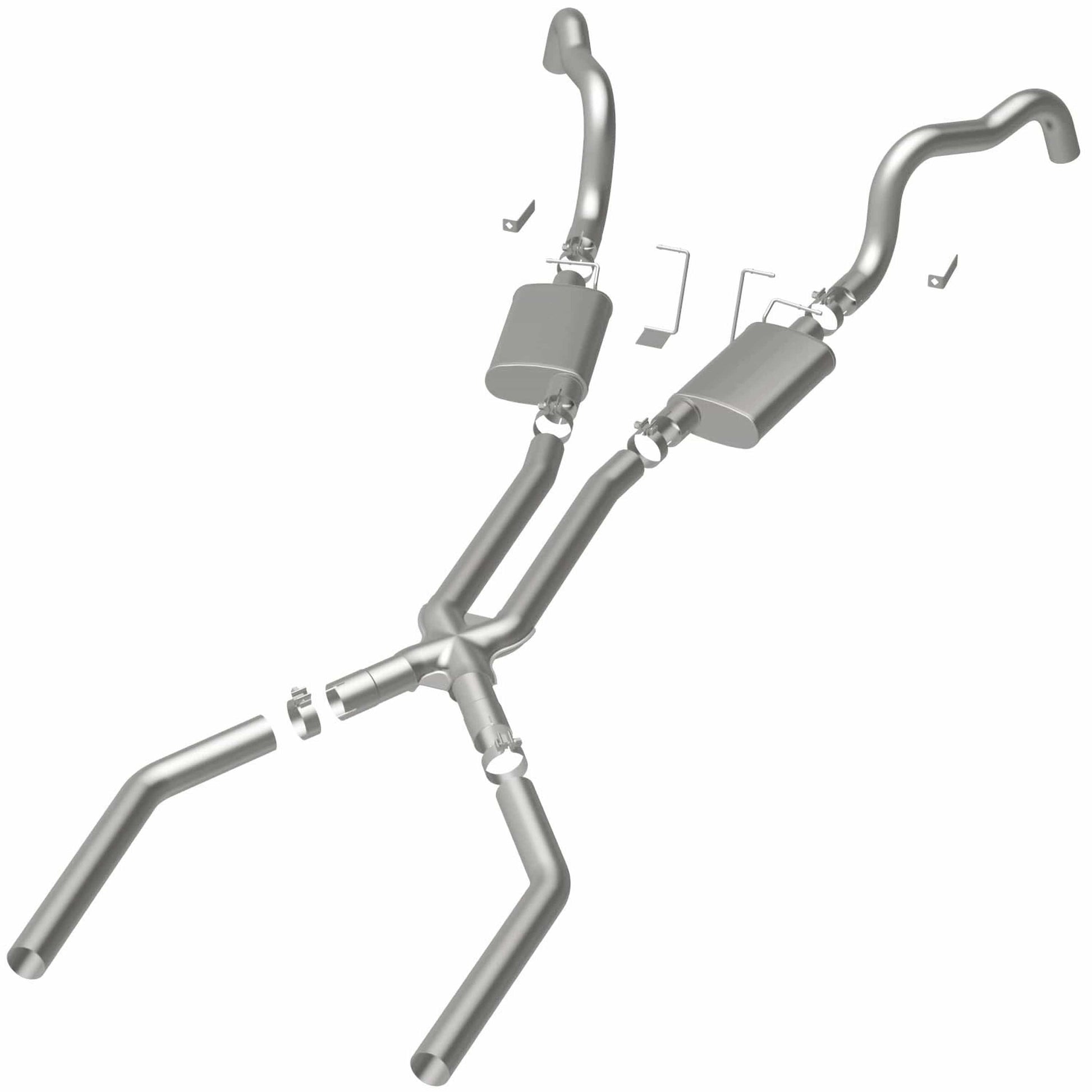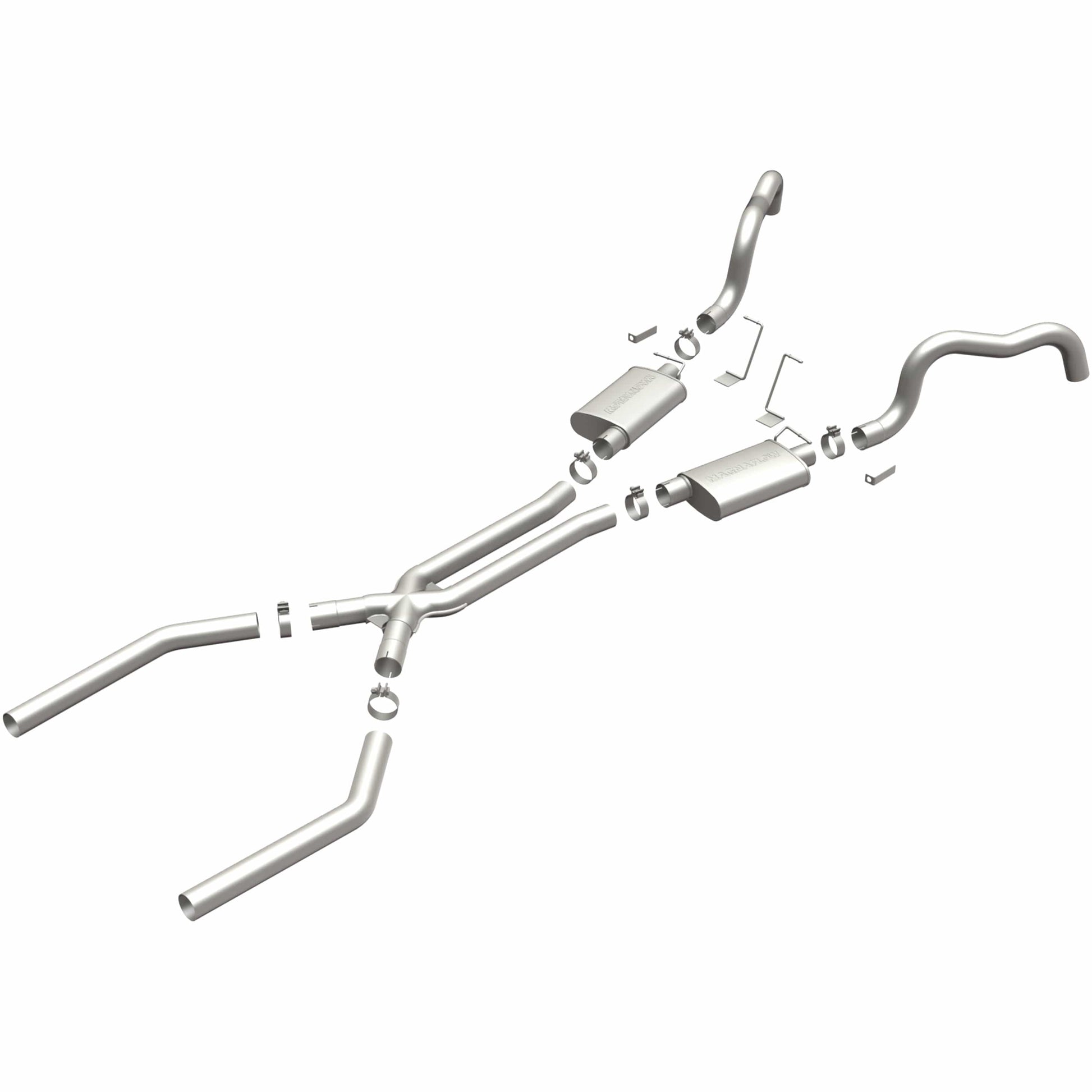 The MagnaFlow Street Series Crossmember-Back Performance Exhaust System 15899 brings enhanced engine sound and dyno-proven performance to your muscle car with a healthy helping of our deep, resonant signature exhaust note at Aggressive exterior and Moderate interior sound levels. Thanks to its durable, corrosion resistant stainless steel design, this exhaust system will handle whatever tarmac you decide to leave your mark on. This performance exhaust kit features a crossmember-back layout designed to replace your exhaust system from the crossmember on back. With its fast-flowing, mandrel bent 3in. main piping and 2 Straight-Through mufflers ending in a Dual Split Rear exit that you can enhance with tips of your choosing, your muscle car will be sounding as awesome as it looks. Extensive 3D scanning during development has resulted in a direct-fit design that you can easily install yourself. 15899 is produced using CNC precision robotic manufacturing techniques and is backed by MagnaFlow's limited lifetime construction warranty.