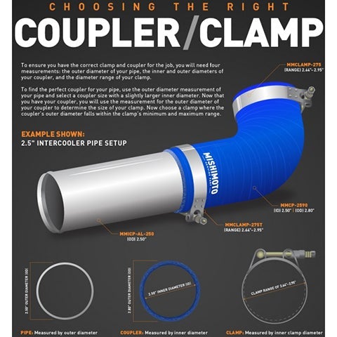Mishimoto has developed a silicone transition coupler that measures 2.25" to 2.5", available in black, blue, red, purple, green or white.