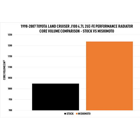 The Mishimoto 1998-2007 Toyota Land Cruiser J100 Performance Aluminum Radiator is an ideal upgrade for the brittle stock radiator. Our radiator boasts a 19% greater core volume and 26.5% greater coolant capacity to improve cooling efficiency. The Mishimoto Toyota Land Cruiser J100 radiator features durable, aircraft-quality, aluminum end tanks that are precision TIG-welded to the 56mm-thick core for superior durability.
