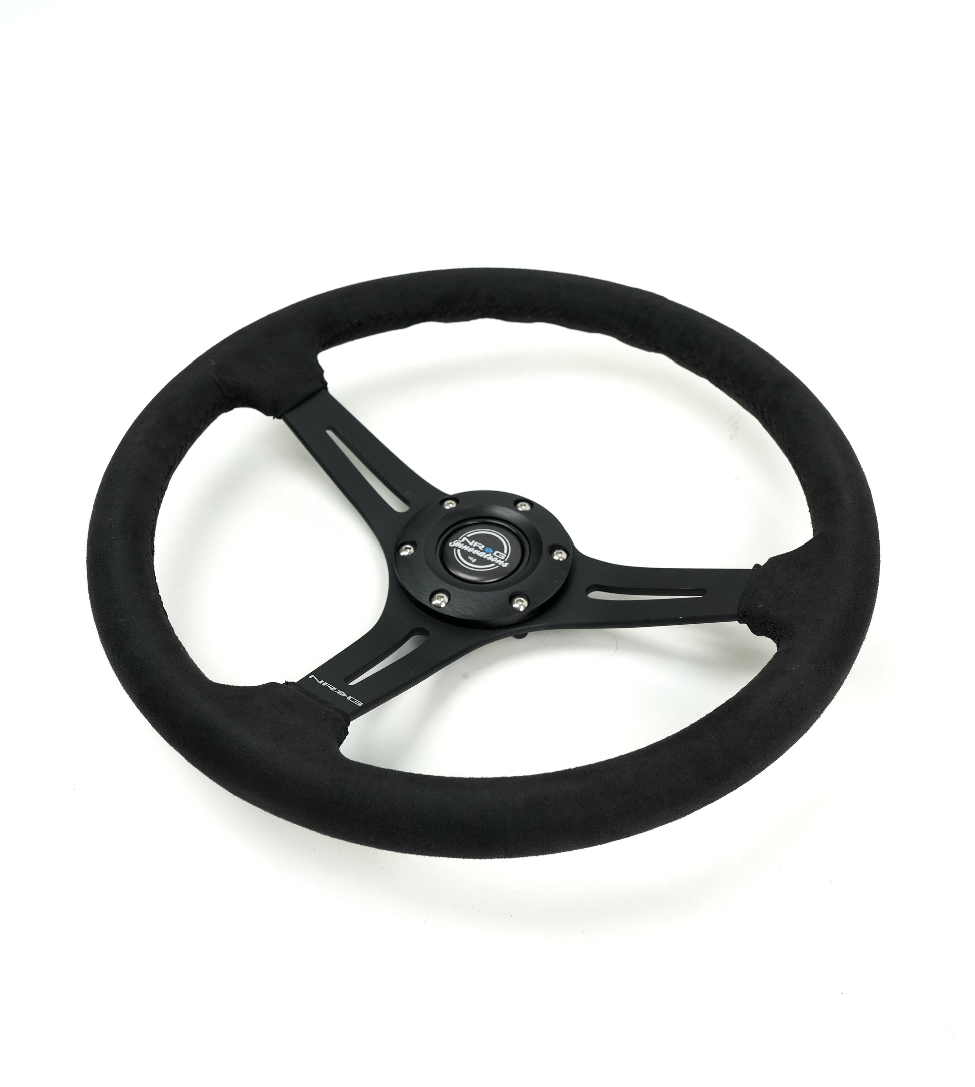 Our signature 64mm deep Steering Wheel, featuring a slit spoke design over the typical circular cut-outs, wrapped in alcantara.