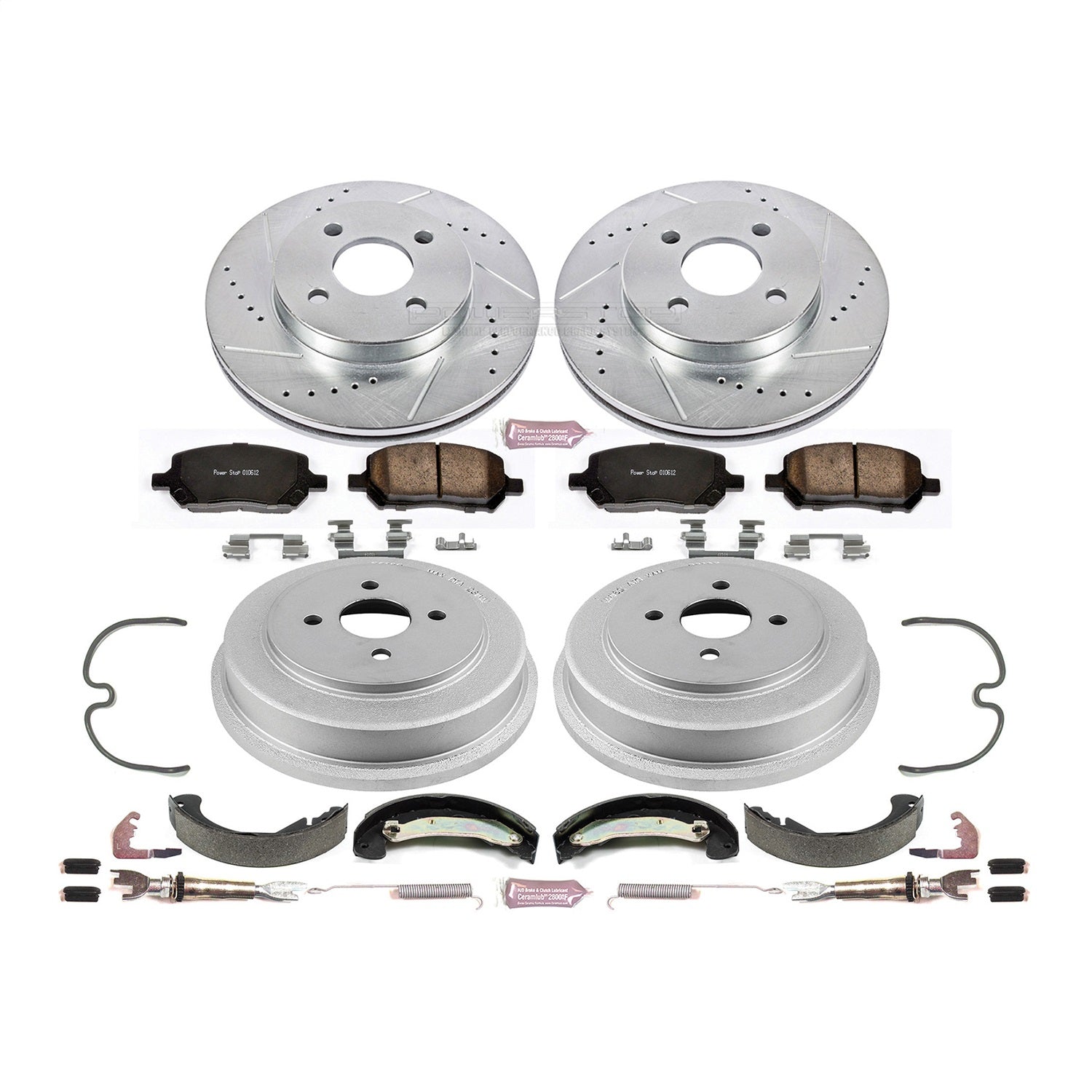 Z17 DIRECT REPLACEMENT KIT: ROTORS; CERAMIC PADS W/HARDWARE; COATED DRUMS; SHOES W/HOLD DOWN AND ADJUSTER KIT