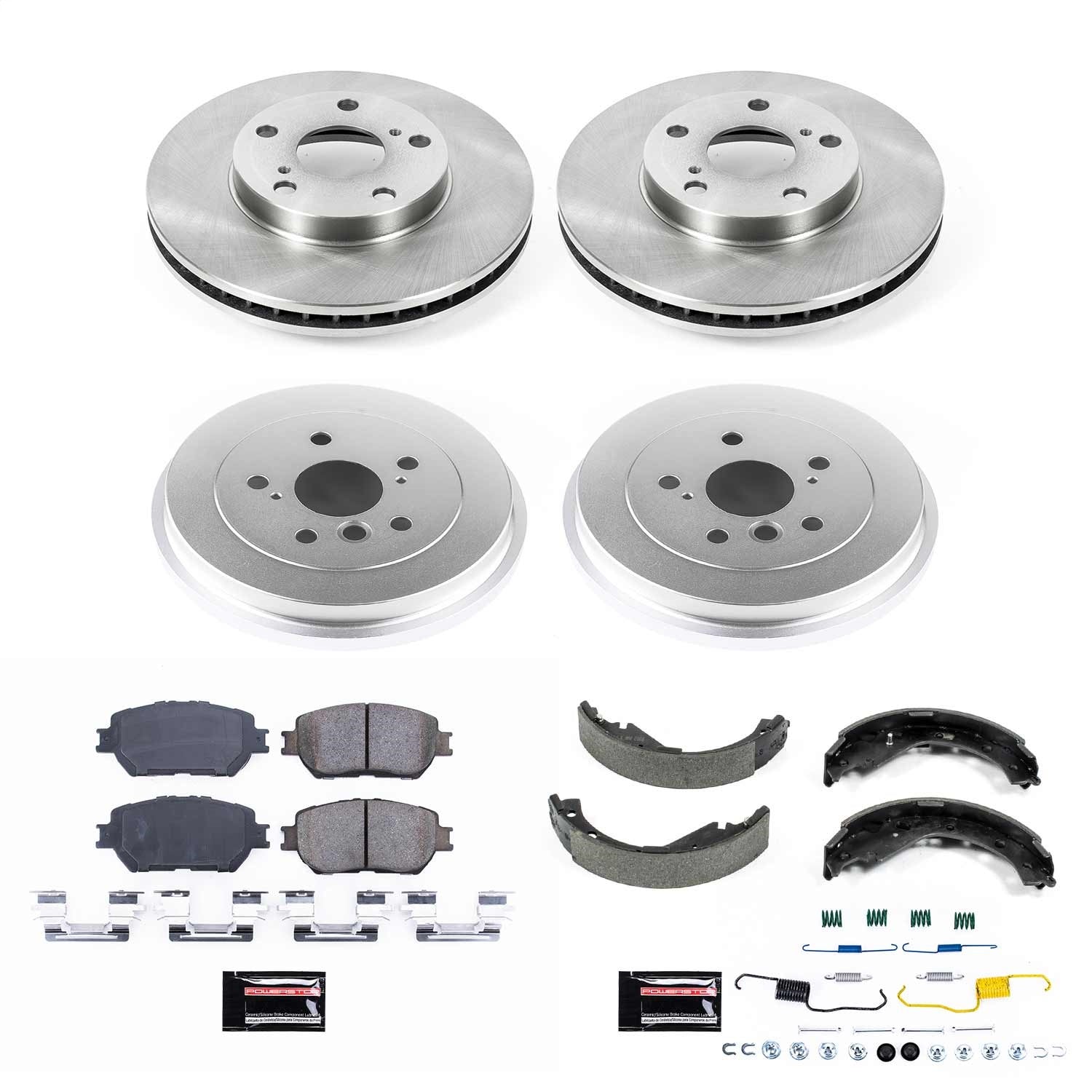Power Stop - Front and Rear OE Stock Replacement Low-Dust Ceramic Brake Pad, Rotors with Drum + Shoe Kit