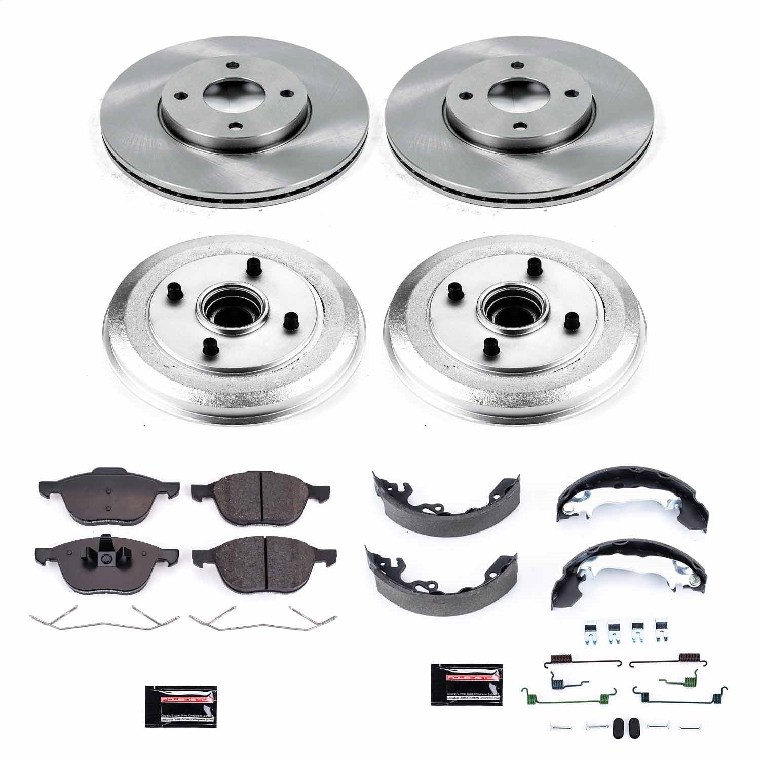 Power Stop - Front and Rear OE Stock Replacement Low-Dust Ceramic Brake Pad, Rotors with Drum + Shoe Kit
