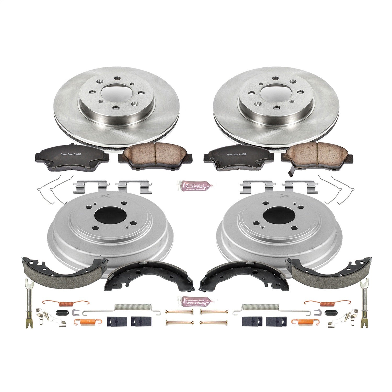 Z17 DIRECT REPLACEMENT KIT: ROTORS; CERAMIC PADS W/HARDWARE; COATED DRUMS; SHOES W/HOLD DOWN AND ADJUSTER KIT