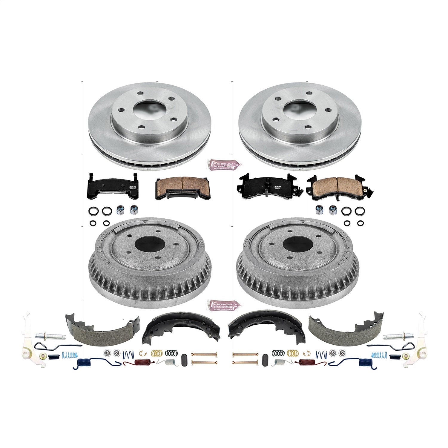 Z17 DIRECT REPLACEMENT KIT: ROTORS; CERAMIC PADS W/HARDWARE; COATED DRUMS; SHOES W/HOLD DOWN AND ADJUSTER KIT