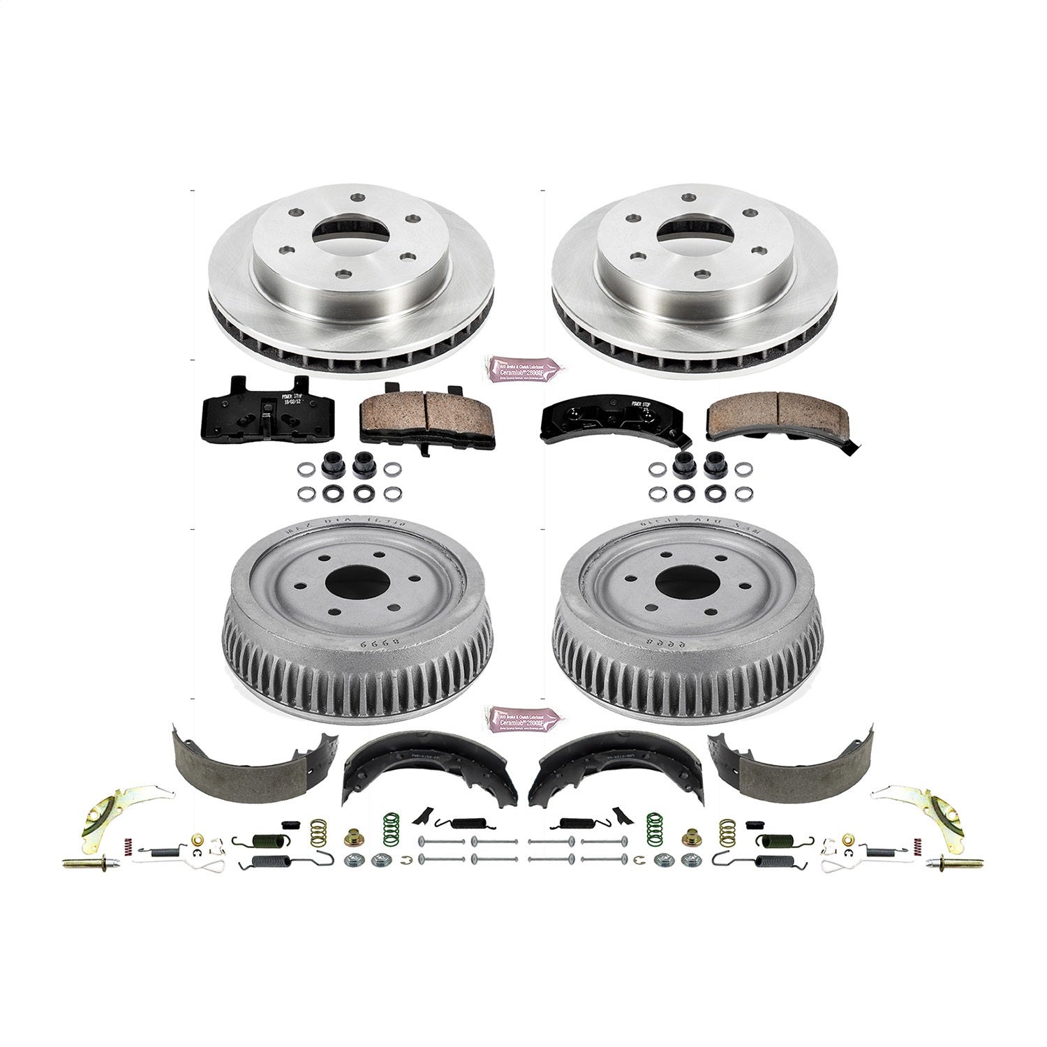 Z17 DIRECT REPLACEMENT KIT: ROTORS; CERAMIC PADS W/HARDWARE; COATED DRUMS; SHOES W/HOLD DOWN AND ADJUSTER KIT