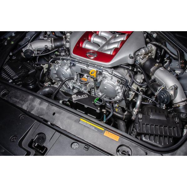 This R35 GT-R kit directly replaces the plastic Nissan tank without making permanent modifications to the vehicle. A specially designed mounting bracket secures to existing threaded holes and Radium adapter fittings interface with the factory lines. The tank functionality remains the same as the OEM cooling system.