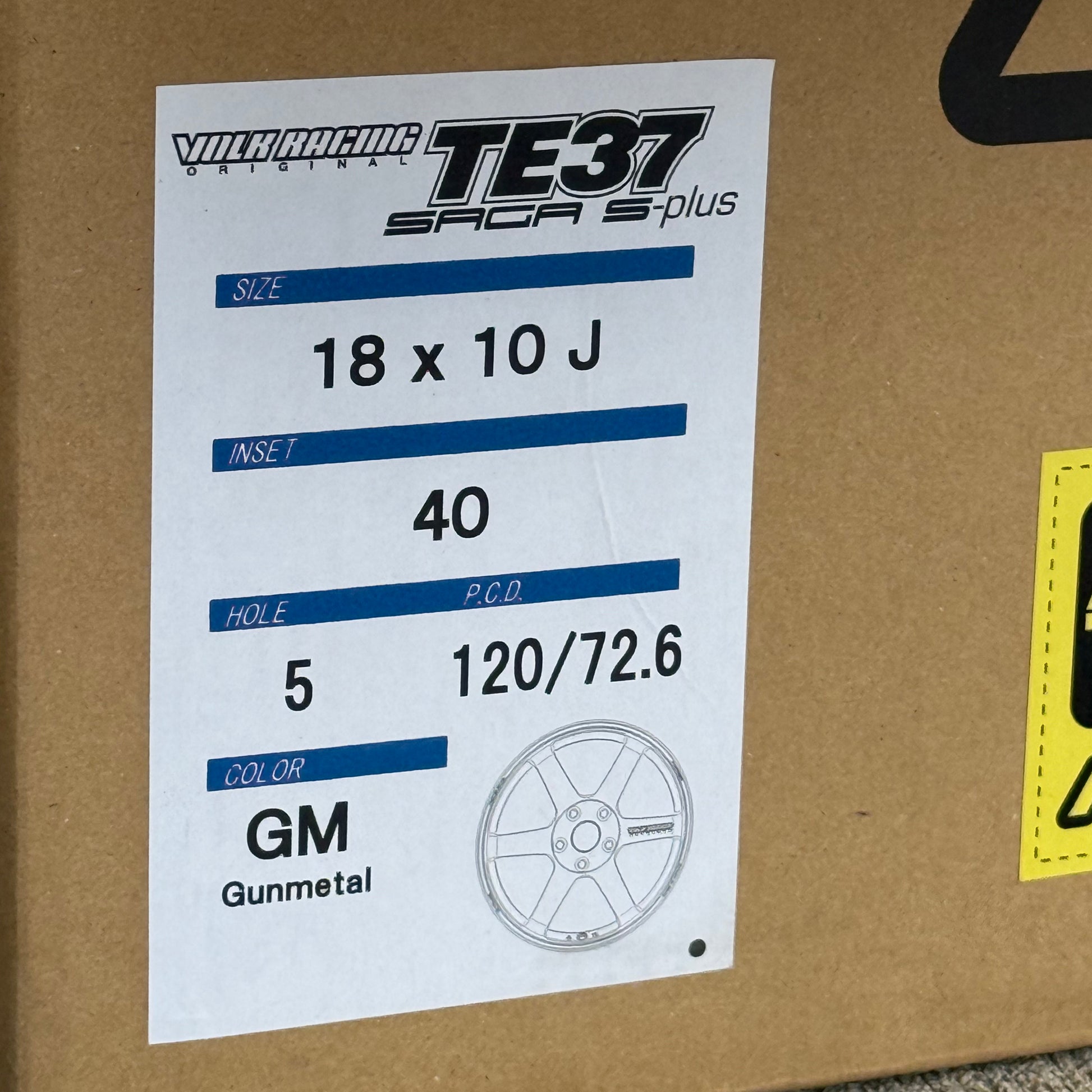 This TE37 Saga S-Plus wheel measures 18" × 10" with a +40mm offset, designed for Honda Civic Type R FK8 / FL5 and Acura Integra Type-S DE5. The gunmetal finish is applied to a forged wheel, sold as a full set of 4 wheels.