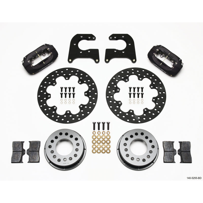 FDL Rear Drag kits are true bolt-on kits available for all popular muscle car rear axles and aftermarket rears built with custom axle ends. Kits in this group are purpose built for sportsman category door cars and others with full functional four-wheel disc brakes. Based on the specific style of housing end and axle offset, mounting kits securely install the four-piston forged Dynalite caliper over 3/8" plate steel rotors that are mounted to the axle with an aluminum hat. Standard kits include solid face rotors, with optional drilled rotor kits available to further reduce driveline weight in classes where every weight advantage is necessary.